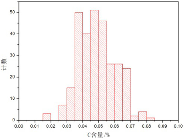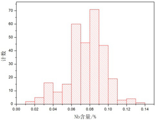 在西氣東輸二線(xiàn)等重大管道工程建設的推動(dòng)下, X80管線(xiàn)鋼得到了大量應用,國內各鋼鐵企業(yè)根據自身的特點(diǎn),開(kāi)發(fā)出了多種合金體系的X80管線(xiàn)鋼,其化學(xué)成分差異較大,甚至同一企業(yè)在不同階段生產(chǎn)的管線(xiàn)鋼化學(xué)成分也有很大差異[8]。這種化學(xué)成分上的較大差異,會(huì )降低焊接工藝和焊材的適用性,增加管道現場(chǎng)焊接難度,加劇焊縫力學(xué)性能波動(dòng),并可能會(huì )給管道服役帶來(lái)安全隱患。對于壁厚20 mm以上的X80管線(xiàn)鋼,這一問(wèn)題尤為突出。為了解決這一難題,在西二線(xiàn) X80管線(xiàn)鋼應用經(jīng)驗的基礎上,通過(guò)試驗研究,進(jìn)一步優(yōu)化X80管線(xiàn)鋼化學(xué)成分,縮小化學(xué)成分波動(dòng)范圍,從而穩定X80管線(xiàn)鋼管質(zhì)量和現場(chǎng)焊接工藝窗口,提高管線(xiàn)本質(zhì)安全。對OD 1 422 mm X80管線(xiàn)鋼采用低C、 Mn成分設計,并加入適量的Mo、 Ni、 Nb、 V、 Ti、 Cu、Cr等元素。經(jīng)對西二線(xiàn)等天然氣管道工程用X80鋼管的化學(xué)成分及焊接結果進(jìn)行研究分析發(fā)現 ,管線(xiàn)鋼中C、 Mn、 Nb的劇烈波動(dòng)(圖 1~3),對焊接性能有較大影響。管線(xiàn)鋼中C是增加鋼強度的有效元素,但是它對鋼的韌性、塑性和焊接性有負面影響[9]。降低C含量可以改善管線(xiàn)鋼的韌脆轉變溫度和焊接性,但C含量過(guò)低則需要加入更多的其它合金元素來(lái)提高管線(xiàn)鋼的強度,使冶煉成本增高[10]。綜合考慮經(jīng)濟和技術(shù)因素, C含量應控制在0.05%~0.07%之間。