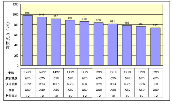 采用Driver和Playdon提出的管道刺穿抗力的半經(jīng)驗估算模型[16],計算了不同管徑、不同設計系數下X80管道的刺穿抗力,結果如圖 9所示?梢钥闯,在相同操作壓力和設計系數下, OD 1 422 mmX80管道比OD 1 219 mm X80管道的刺穿抗力要大,主要因為管道壁厚的增加。以0.72的設計系數為例,OD 1 422 mm X80與OD 1 219 mm X80管道相比,刺穿抗力提高約16.7%。在操作壓力、外徑相同的條件下,設計系數提高,管道刺穿抗力降低,這是因為,設計系數的提高將降低對管道壁厚的需求。