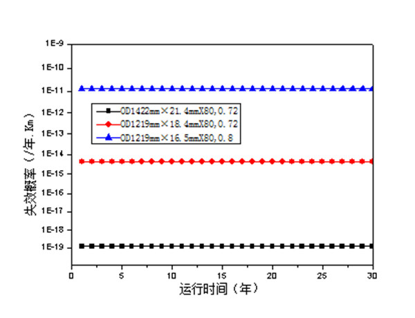 設備撞擊是與時(shí)間無(wú)關(guān)的風(fēng)險因素,失效概率不隨時(shí)間變化,如圖 11所示。在第三方損壞預防措施(地上和地下定位標記、尋呼系統、監視間隔和方法參照類(lèi)似管線(xiàn)的設置)、第三方活動(dòng)頻率、挖掘設備參數相同的情況下,第三方設備沖擊引起的管道失效概率與管道壁厚相關(guān)。 0.72設計系數OD 1 422 mm X80管道設備撞擊失效概率最低。