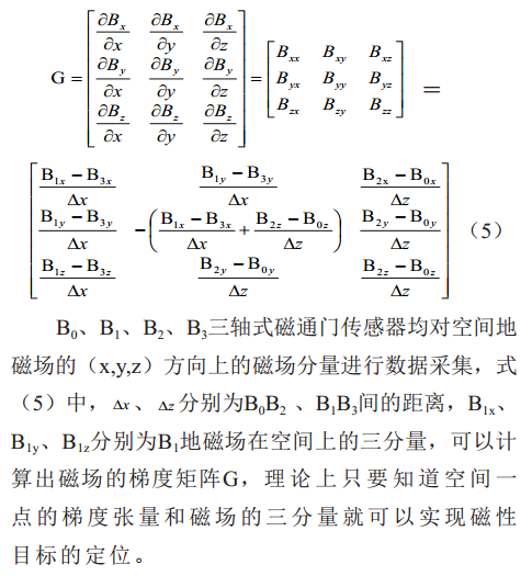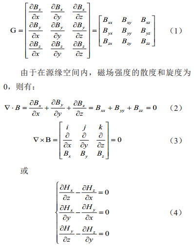 地磁場(chǎng)有方向和大小矢量場(chǎng),磁梯度張量就是磁場(chǎng)強度在三維空間中的三個(gè)分量Bx、 By、 Bz在空間兩兩垂直的三個(gè)方向(x,y,z)上的變化率,它構成一個(gè)三階矩陣,共9個(gè)元素,記為G,表示如下: