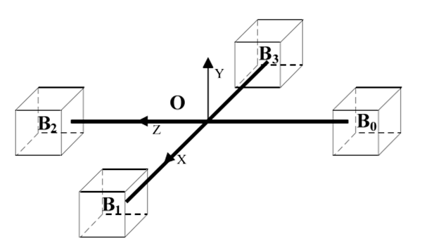 如圖 2所示, B0、 B1、 B2、 B3為三軸式磁通門(mén)傳感器,每個(gè)三軸磁通門(mén)傳感器均由3個(gè)單軸三端式磁通門(mén)傳感器組合而成。根據公式(1)、(3)差分近似可得以下結果: