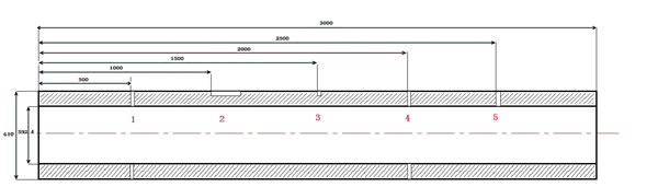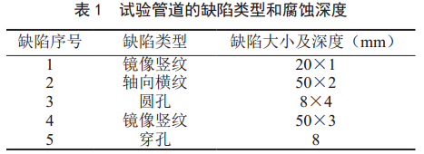 某熱力公司管道長(cháng)3 000 mm、外徑610 mm、壁厚8.8 mm,在其管道上方加工了5個(gè)人工缺陷。圖 4為試驗管道的俯視圖,各位置缺陷類(lèi)型和腐蝕深度見(jiàn)表1。