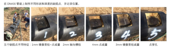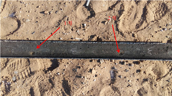 檢測管道分兩排共6段,兩排長(cháng)度都是3 800 mm,壁厚3.0~4.5 mm,管道埋深1 500~1 700 mm。其中: 1#、 3#管道表面有防腐層,直觀(guān)無(wú)法看見(jiàn)管道缺陷位置; 2#鋪設年份較久,表面腐蝕非常嚴重; 4#表面無(wú)明顯缺陷 ,5#有三處鋸槽(10×0.4×0.3 mm), 6#有5處穿孔缺陷,其中2處同時(shí)含有兩個(gè)直徑6~7 mm孔洞(圖 7)。