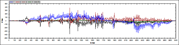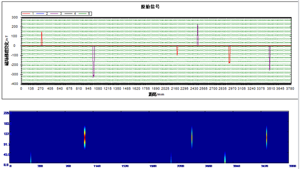 為了保證試驗數據的準確性,用逐漸埋土的方式,分別進(jìn)行了埋深1 200 mm、 1 500 mm、 1 800 mm試驗。首先將預置好缺陷的管道放入已挖好的土坑內,然后在管道正上方鋪設非鐵磁性材料軌道,通過(guò)自制小車(chē)在軌道上帶動(dòng)弱磁傳感器在管道上方勻速移動(dòng),將傳感器接收到的數據經(jīng)過(guò)數據采集器傳輸至上位機。上位機內安裝有弱磁檢測數據處理軟件?紤]到試驗過(guò)程中因為管道端頭效應,造成信號啟停處的突變,在數據處理時(shí)將端頭效應的信號屏蔽,防止影響整體信號造成對檢測結果的誤判。圖 5是試驗現場(chǎng),左側是試驗前在管道上方預置的5個(gè)缺陷。圖 6是埋深1 800 mm檢測數據處理結果。