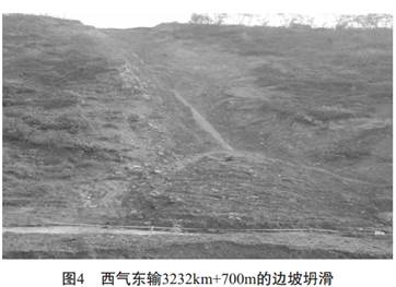 圖4為西氣東輸管道3232km+700m里程處的邊坡坍滑體, 管道沿60~70m高的山坡鋪設, 埋深2.4m, 回填土為當地的黃土狀土, 土質(zhì)松散,雨水浸泡后產(chǎn)生坍滑, 將坡腳擋墻擠毀并越頂堆積于前緣, 致使管道外露并形成危害。
