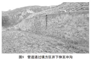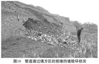 由于沖溝洪水沖刷擋墻基礎等原因, 致使擋墻出現10m多長(cháng)的垮塌, 相鄰的一段擋墻出現10~15m的開(kāi)裂現象, 擋墻支護功能的部分失效已危及到管線(xiàn)的安全。