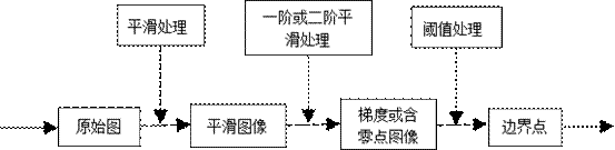 邊緣檢測處理流程如圖2所示。原始圖像經(jīng)平滑處理后,平滑圖像再經(jīng)一階或二階平滑處理,得到梯度或含零點(diǎn)圖像,再經(jīng)閾值處理,確定邊界點(diǎn)。邊緣即圖像中灰度發(fā)生急劇變化的區域,可以通過(guò)求解一階導數或二階導數檢測出圖像中灰度不連續區域,即邊緣區域。二值化之后的圖像只存在0和255兩種灰度值,通過(guò)求取一階導數最大值便可檢測出其邊界。