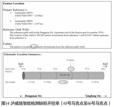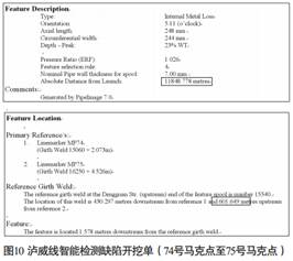筆者以2008年8月的屏忠線(xiàn)檢測數據生成的一張缺陷開(kāi)挖單舉例做簡(jiǎn)單說(shuō)明。 見(jiàn)圖1, 上游A084號馬克點(diǎn)在6680號環(huán)焊縫下游2.4米處, 下游A079號馬克點(diǎn)在7630號環(huán)焊縫下游6.1米處, 兩點(diǎn)間距為748.2米(495.8米+252.4米) , 上游點(diǎn)距離缺陷點(diǎn)較近的7250焊口495.8米, 下有點(diǎn)距離缺陷點(diǎn)較近的7250焊口252.4米。 那我們使用皮尺從下游點(diǎn)往上游點(diǎn)測量前進(jìn)252.4米, 就是7250焊縫位置, Feature中的“0.0metres”表示缺陷與7250焊縫的距離是0米, 這說(shuō)明缺陷就在焊縫上。
