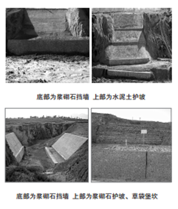 ②過(guò)程期沖溝:指沖溝橫斷面呈梯形或近似梯形,溝底縱剖面上游較陡,下游較緩,以接近均衡剖面。采用素土/灰土/水泥土夯實(shí)回填管溝部分;在兩側斜坡段,從管道底部每間隔5~10m夯筑灰土/水泥土截水墻一道;從管線(xiàn)到?jīng)_溝頂部分水線(xiàn)范圍內整治地表(多采用水泥土護面、草袋護坡等形式),并夯實(shí)回填溝頭谷地;夯實(shí)回填斜坡上的洼地、坑、穴等,防止地表徑流滲入,并在溝坡頂部修筑環(huán)形截水溝,攔截疏導地表徑流。