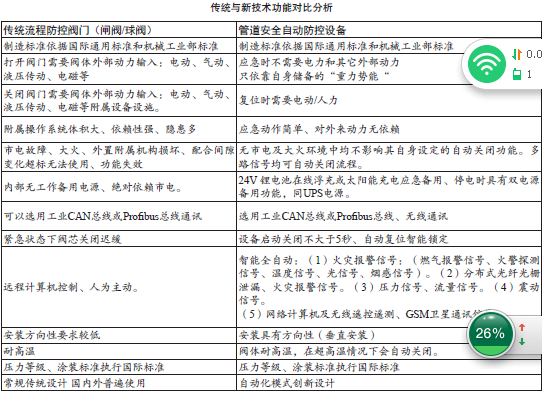 “管道安全自動(dòng)防控設備”自動(dòng)化程度高、使用重力作為設備應急動(dòng)力,保持穩定安全可靠、啟閉迅速。設備所屬電器遵守本安式、隔爆式設計為防爆產(chǎn)品。部件選擇不同材質(zhì),可適用各種介質(zhì)。兼容接收各種警報信號指令、全自動(dòng)響應迅速、調控準確到位。不依賴(lài)市電、液壓、氣源、蓄能器等能源!肮艿腊踩詣(dòng)防控設備”技術(shù)特性見(jiàn)下表。