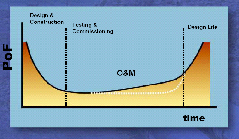 管道安全就是管道的生命,一般在傳統的管理模式下,管道建設投產(chǎn)初期和設計壽命期失效概率較高,在運行期失效概率較低,管道在整個(gè)運行周期內的失效概率一般可以用圖1表示。國際上通常采用完整性管理技術(shù),使管道的失效概率在整個(gè)生命周期內是平穩變化的,增加了管道使用壽命。見(jiàn)圖2所示。