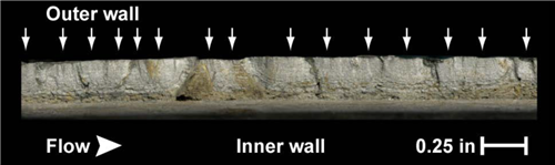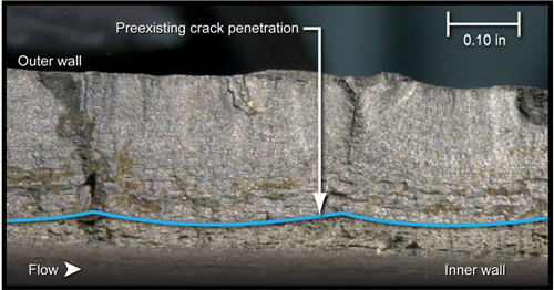 NTSB的檢查顯示斷裂特征是源于管道外表面腐蝕坑的底部,這表明了腐蝕先于裂紋形成,并為裂紋萌生提供了應力集中位置。破裂管段上發(fā)現的斷裂特征與斷裂機理的近中性pH SCC(應力腐蝕開(kāi)裂)和腐蝕疲勞一致。NTSB還觀(guān)察到裂紋源附近和較遠處發(fā)現的止裂線(xiàn)有明顯的差異,這些差異說(shuō)明當裂紋增長(cháng)到管壁更深的位置時(shí)斷裂機理發(fā)生改變。試驗結果顯示在近中性pH SCC的環(huán)境中,當裂紋增長(cháng)到約0.5 mm時(shí),在靜載作用下可能停止增長(cháng),但是在循環(huán)載荷作用下將以與腐蝕疲勞一致的速率增長(cháng)。