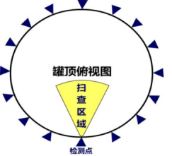 超聲導波檢測是利用超聲高頻導波成像檢測技術(shù),將導波探頭放置在壁板外的底板延接板上,以罐底板作為超聲導波傳導體,借助導波技術(shù)的物理特性,快速發(fā)現罐內底板上下表面腐蝕等壁厚突變信號。配合聲定位技術(shù)使用,可實(shí)現以點(diǎn)帶面的檢測效果,即通過(guò)罐外底板延接板上的一個(gè)檢測點(diǎn)來(lái)覆蓋一個(gè)扇形掃查區域,檢測非常具有代表性。如圖13所示。