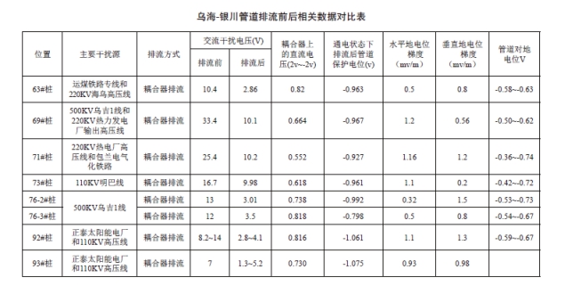 例如,烏海至銀川焦爐煤氣輸氣管道,經(jīng)天津華北市政設計院檢測,發(fā)現有幾處管段受來(lái)自與管道交叉的電氣化鐵路及與管道交叉和并行的高壓線(xiàn)產(chǎn)生的雜散電流的干擾。其中石嘴山市惠農縣正泰太陽(yáng)能發(fā)電廠(chǎng)090#+至093#測試樁,烏海市拉僧廟鎮062#至076#-1測試樁,烏海市海南區043#至061#測試樁段管道受干擾嚴重,管道運營(yíng)管理方采取以下措施進(jìn)行了治理。