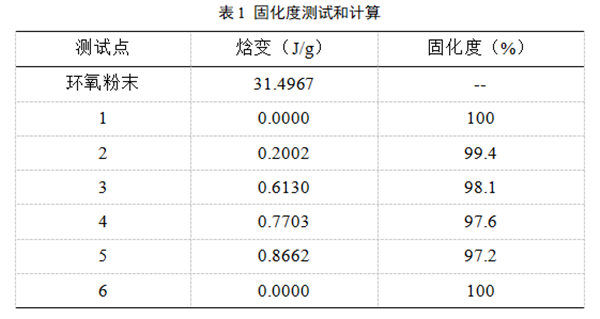 環(huán)氧粉末在固化后與鋼管表面是通過(guò)化學(xué)鍵聯(lián)結的,其抗剝離性能很強,如果環(huán)氧粉末固化不完全,將直接影響到防腐層的質(zhì)量。標準GB/T23257-2009規定環(huán)氧粉末固化度應≥95%。對熔結環(huán)氧層進(jìn)行差示掃描測試(DSC),計算熔結環(huán)氧層的固化度,如圖5和表1所示。