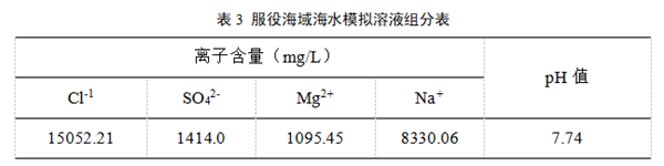 實(shí)驗材料為某防腐廠(chǎng)家按照海洋防腐規格書(shū)預制的3PE管段,采用粘結電解槽法,從實(shí)際管段上切割150mm×150mm的方形試件,并在試件中心預制φ6.4mm的缺陷孔,露出金屬基材。試樣上方粘結外徑為100mm的有機玻璃圓筒。實(shí)驗溶液成分如表3所示,為管道服役海域海水模擬溶液。