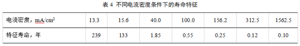 根據擬合結果,可以計算不同電流密度條件下當剝離距離達到15mm時(shí)所需的時(shí)間,計算結果見(jiàn)表4?梢钥闯,隨著(zhù)電流密度的增加,防腐層的壽命特征逐漸降低。