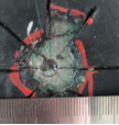 達到測試周期后,拆除電源,用濕布擦洗防腐層表面,觀(guān)察防腐層表面狀況,看是否出現新的漏點(diǎn)及漏點(diǎn)周?chē)栏瘜觿冸x情況,用刨刃在防腐層表面做出米字型的切口,以人為孔為中心,確保防腐層被完全切透至鋼材表面,用尖刀嘗試挑起防腐層,并拍照記錄防腐層被挑起的情況。以缺陷孔中心為起點(diǎn),測量并記錄各個(gè)方向上的剝離距離。