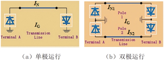 直流輸電系統一般采用兩端直流輸電系統,主要包括單極系統(正極或負極)、雙極系統(正負兩級)、背靠背直流系統(無(wú)直流輸電線(xiàn)路)三種類(lèi)型。如圖4所示,當直流接地系統正常運行時(shí)為雙極運行模式,此時(shí)由兩接地極和輸電線(xiàn)構成回路,流經(jīng)大地的電流僅為運行電流的1%~3%(對稱(chēng)運行系統)或兩極電流之差(非對稱(chēng)運行系統);當直流接地極系統在運行初期或發(fā)生故障和檢修時(shí)為單極運行模式,此時(shí)大地作為一根導線(xiàn)加入到輸電系統中,電流從受端接地極流經(jīng)大地返回到送端接地極,入地電流為系統額定直流電流,數值會(huì )達到幾千安培,瞬間大電流會(huì )擊穿埋地管道防腐層造成管道穿孔,并且會(huì )燒毀附近的陰保設備,對操作人員造成人身傷害[5,6]。