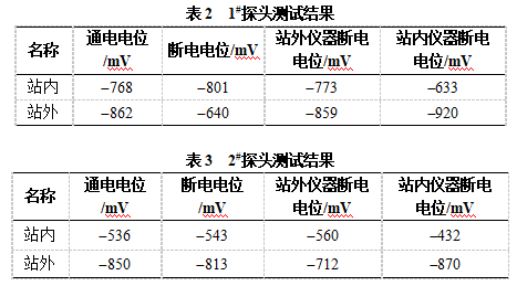 通過(guò)測試發(fā)現末站站內外干擾最嚴重,特別是絕緣法蘭兩端的電位干擾影響最大。在該處安裝2個(gè)測試探頭、離站最近的站外測試樁處安裝測試試片,探頭極化48h后,測試1#探頭和2#探頭的通電和斷電電位,然后分別在恒電位儀處斷開(kāi)站外和站內恒電位儀,再測試探頭處的電位,結果見(jiàn)表2、3。