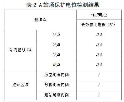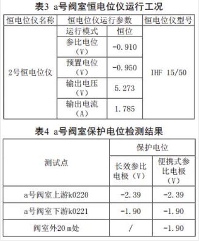 對a號閥室恒電位儀的運行工況及保護電位進(jìn)行了檢測,結果分別見(jiàn)表3、表4。