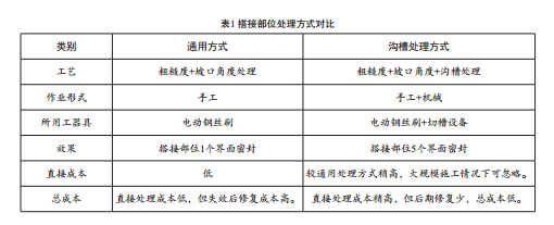 采用溝槽處理方式,與通用搭接部位處理方式的比較見(jiàn)表1:
