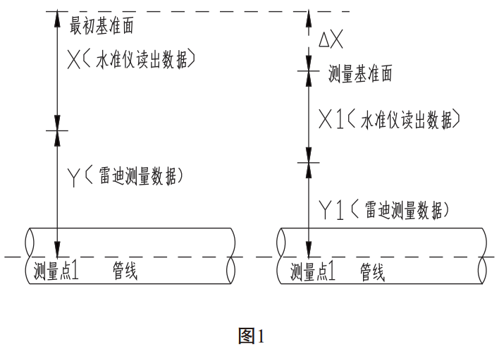(1)同一測量點(diǎn)進(jìn)行下次測量時(shí),如果所選擇測量基準面較最初基準面低,△X為基準面的差值,通過(guò)現場(chǎng)實(shí)際測量確定。如圖2: