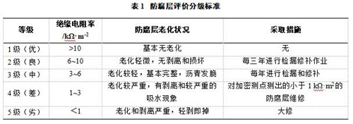 測試與評價(jià)參考標準為SY/T 5918—2004《埋地鋼質(zhì)管道外防腐層修復技術(shù)規范》,對應分級標準見(jiàn)表1。