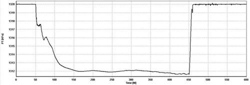 根據2014年12月16日東臨管線(xiàn)濱州站至惠民站盜油事件現場(chǎng)數據,優(yōu)化驗證泄漏模型。由圖4、5可見(jiàn),盜油時(shí),管道壓力變化分為3個(gè)階段,分別為管道壓力下降階段、管道壓力穩定階段、管道壓力恢復階段。對比現場(chǎng)檢測與仿真結果,可以看出,盜油事件發(fā)生后,管道壓力變化趨勢、泄漏過(guò)程與實(shí)際比較吻合。由此可見(jiàn),仿真模型能準確模擬現場(chǎng)情況,模型精度高、有效性強。