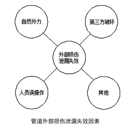 主要表現在三個(gè)方面:一是山體滑坡、塌方、雨水沖刷、河流改道、水土流失或黃土沉陷等自然外因造成管道錯斷或破裂,多發(fā)生在雨天、季節變換時(shí)節。二是第三方破壞,在管道附近進(jìn)行取土、挖掘、基建等機械施工,以及不法分子打孔盜油,都會(huì )造成管道破裂泄漏。三是因崗位人員的技能素質(zhì)、應變能力、責任心等差異導致的誤操作,也會(huì )引起管道運行失控,甚至發(fā)生泄漏。這三個(gè)方面的原因造成的管道泄漏,均具有隨機性、不確定性、瞬時(shí)性特點(diǎn),屬管道外部失效因素,發(fā)生概率相對較小[1]。如下圖所示。