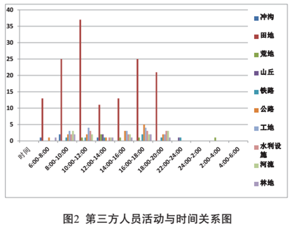 從圖2的統計分析來(lái)看,在22:00~24:00、2:00~4:00兩個(gè)時(shí)段,發(fā)生2處高風(fēng)險異常人員情況。1處是在管道附近違章修建溫室大棚,并確認未向管道保護部門(mén)報告,另1處是山丘管道路由10米內非法取土,未通知管道管理部門(mén)。其他時(shí)段管道周邊田地勞動(dòng)人數達到145人,經(jīng)分析和驗證,屬于田地耕種管理的正常生產(chǎn)活動(dòng),沖溝位置大數據驗證為正在進(jìn)行退耕還林栽種作業(yè)。