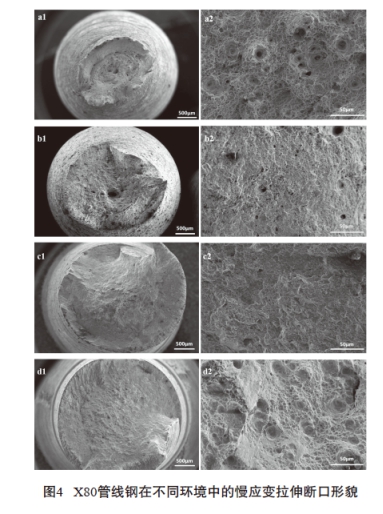 不同條件下拉伸斷口的掃描電鏡照片如圖4 所示,圖a為空氣中的拉伸斷口,宏觀(guān)斷口出現明顯的緊縮(圖a1),微觀(guān)斷口形貌為韌窩狀(圖a2)。圖b~d依次為農田、戈壁和沙漠三種土壤模擬溶液中-1.1Vvs.SCE電位下的斷口形貌。與空氣中相比,三種模擬溶液中斷口的頸縮程度依次減小,微觀(guān)形貌以準解理狀形貌為主,說(shuō)明在-1.1Vvs.SCE電位下不同土壤模擬溶液中X80鋼具有明顯的氫脆敏感性,同時(shí)也表明X80鋼的氫脆敏感性會(huì )受到外部環(huán)境的影響,三種土壤環(huán)境對斷口的影響規律與前面的計算結果一致。