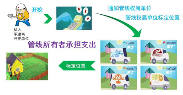 美國聯(lián)邦法律、各州法律規定:地下挖掘前必須撥打811一呼通電話(huà)。諸如修路、挖渠、敷設新的管道或地下電纜,甚至種樹(shù)、埋設交通燈支柱等都要事先撥打811電話(huà),告訴一呼通接線(xiàn)員“挖掘的地理位置、施工類(lèi)型、時(shí)間要求”等需求信息。一呼通呼叫中心詳細記錄這些信息后,立刻通過(guò)系統查找需要挖掘區域的地下管線(xiàn)情況,然后電話(huà)通知到有關(guān)地下管網(wǎng)權屬單位。由管線(xiàn)權屬單位派人攜帶專(zhuān)業(yè)地下管線(xiàn)探測儀到挖掘現場(chǎng)核對地下管線(xiàn)的實(shí)際位置。管線(xiàn)權屬單位代表與施工單位協(xié)商后,在地面清楚標記可挖和不可挖區域。并由管線(xiàn)權屬單位承擔本單位管線(xiàn)現場(chǎng)定位、標注費用。如果施工單位沒(méi)有通過(guò)811電話(huà)擅自開(kāi)挖,則屬違法行為。承建商與施工單位必須承擔由此帶來(lái)的一切后果(見(jiàn)圖2)。