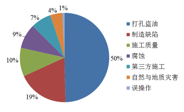 2006—2015年共發(fā)生管道泄漏事件134起,打孔盜油是最主要的失效因素,制造缺陷次之,施工質(zhì)量居第三位(圖)。