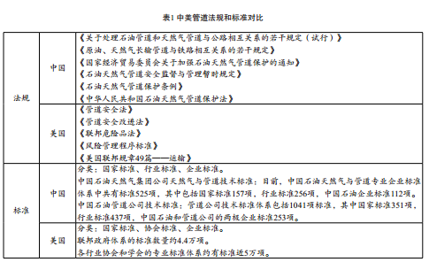 (1)學(xué)習國外先進(jìn)管理經(jīng)驗相對于發(fā)達國家的管道法規和標準體系,我國無(wú)論是技術(shù)水平還是管理水平都存在一定差距。美國是世界上擁有油氣管道最多的國家,制定了一系列管道安全技術(shù)法規,建立了完善的標準管理體制,值得研究和借鑒,詳見(jiàn)表1。