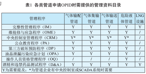 2012年3月21日,美國交通運輸部管道和危險材料安全管理局(Pipeline and Hazardous MaterialsSafety Administration ,PHMSA)頒布了一份聯(lián)邦公告,并對聯(lián)邦法典49 CFR 191.22 和195.64兩個(gè)章節進(jìn)行修訂,要求所有油氣管道運營(yíng)商應取得PHMSA頒發(fā)的運營(yíng)商注冊號(Operator IdentificationNumber, OPID)。PHMSA建立了國家管道注冊管理信息系統,供管道運營(yíng)商在線(xiàn)提交OPID申請書(shū)。申請書(shū)及相關(guān)材料經(jīng)PHMSA審核合格后,由PHMSA核準頒發(fā)OPID編號[2~3]。在OPID申請書(shū)中,管道運營(yíng)商需要填寫(xiě)管道基本信息、相關(guān)安全管理人員聯(lián)系方式,并提供相關(guān)管道安全管理制度。在管道基本信息中要詳細描述管道類(lèi)型、介質(zhì)類(lèi)型、州際管道/州內管道、途經(jīng)州/縣名稱(chēng)及各州縣管道長(cháng)度。各類(lèi)管道申請OPID時(shí)需要提供的管理制度資料目錄見(jiàn)表1。管道運營(yíng)商在獲得OPID后,如果企業(yè)的安全管理程序發(fā)生變更,需要重新提交PHMSA備案[2~3]。