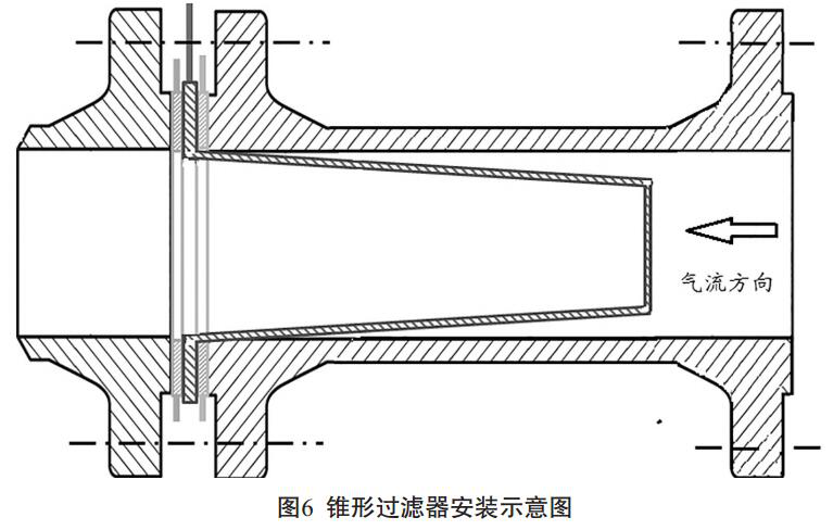錐形過(guò)濾器安裝在壓縮機入口兩個(gè)法蘭片之間,使用兩個(gè)金屬纏繞墊片,如圖6所示。由于拆卸后法蘭之間的間隙增大,拆卸、安裝可能對壓縮機對中造成影響,擔心雜質(zhì)進(jìn)入損壞壓縮機,所以管道企業(yè)一般在壓縮機組投產(chǎn)后都不進(jìn)行拆除。但是,這個(gè)錐形過(guò)濾器畢竟只是一個(gè)臨時(shí)過(guò)濾器,曾經(jīng)出現過(guò)過(guò)濾器損壞造成壓縮機振動(dòng)的問(wèn)題。雖然已在壓縮機組的招標技術(shù)規格書(shū)中要求將該過(guò)濾器改為永久安裝形式,但廠(chǎng)家也可能不予采納。