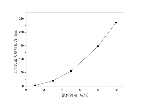 利用fluent軟件模擬液體流速為1 m/s、3 m/s、5 m/s、8 m/s、10 m/s條件下直管段管壁剪切力受力情況,