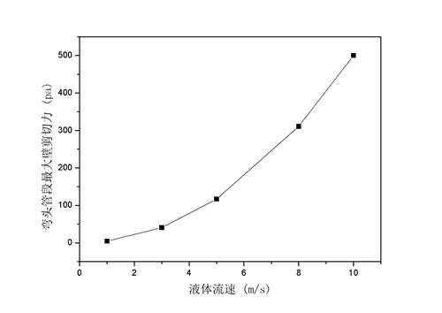 圖5  彎管管壁最大剪切力隨液體流速變化趨勢