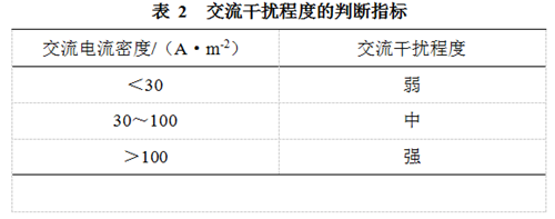 穩態(tài)的交流干擾可能導致管道發(fā)生交流腐蝕。目前,對于交流腐蝕的評價(jià)指標國際上尚未統一。GB/T 50698―2011《埋地鋼質(zhì)管道交流干擾防護技術(shù)標準》吸取了歐洲標準規定:當管道上的交流干擾電壓不高于4 V時(shí),可不采取交流干擾防護措施;高于4 V時(shí),應采用交流電流密度進(jìn)行評估。當交流電流密度在30 A/m2以下時(shí),交流腐蝕風(fēng)險較弱(表 2)。