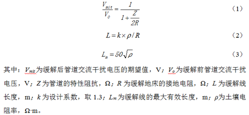 傳統的經(jīng)驗公式設計主要針對單點(diǎn)排流,采用幅值處緩解方針,根據現場(chǎng)調研和檢測結果,初步確定緩解方式和地床大小,再根據現場(chǎng)模擬緩解試驗確定緩解點(diǎn)和緩解量。對于不具備現場(chǎng)試驗的地段,可以根據經(jīng)驗公式(1)和(2)計算緩解量和緩解線(xiàn)長(cháng)度。對于穩態(tài)交流干擾而言,緩解效果主要依賴(lài)于緩解地床的接地電阻[8]。由于緩解的本質(zhì)基于平均管地電位差,所以一味地增加緩解線(xiàn)長(cháng)度以期降低接地電阻從而達到更好的緩解效果是不現實(shí)的。有學(xué)者提出存在緩解線(xiàn)長(cháng)度極值,當緩解線(xiàn)長(cháng)度大于該值時(shí),增加緩解線(xiàn)長(cháng)度并不能再有效地降低管道交流干擾電壓,該長(cháng)度極值可根據公式(3)大致確定[9]。傳統方法操作簡(jiǎn)單,適用于干擾程度和范圍較小的情況,是一種單點(diǎn)設計法,無(wú)法對管道全線(xiàn)進(jìn)行綜合考慮,存在一定的局限性。