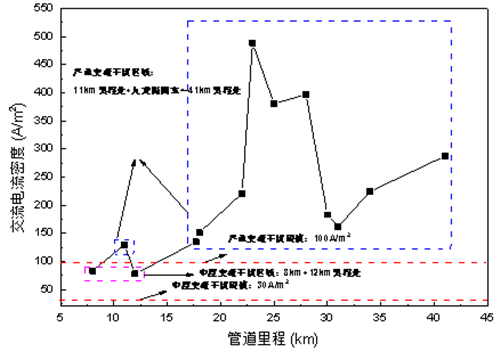 圖 1  管道沿線(xiàn)交流干擾電壓和交流電流密度分布