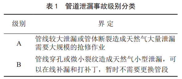 依據《國家安全生產(chǎn)管理局石油天然氣搶險應急預案》《石油天然氣管道安全規范》(SY6186-1996)、美國聯(lián)邦法規49CFR192對危害預防程序和應急計劃的要求,以及管線(xiàn)失效機理的估算,確定管線(xiàn)泄漏事故級別(見(jiàn)表 1)。
