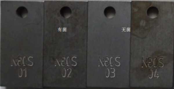 根據NACE RP0775―2005,從表 2可以看出:①N80S在無(wú)菌環(huán)境中腐蝕速率為0.021 mm/a,有菌環(huán)境中的腐蝕速率是無(wú)細菌環(huán)境中的8.48倍,分別屬于輕度腐蝕和嚴重腐蝕。②N80在無(wú)菌環(huán)境中腐蝕速率為0.114 mm/a,有菌環(huán)境中的腐蝕速率是無(wú)細菌環(huán)境中的1.31倍,分別屬于中度腐蝕和嚴重腐蝕。③BG90SS在無(wú)菌環(huán)境中腐蝕速率為0.102 mm/a,有菌環(huán)境中的腐蝕速率是無(wú)細菌環(huán)境中的1.41倍,分別屬于中度腐蝕和嚴重腐蝕。④L245N在無(wú)菌環(huán)境中腐蝕速率為0.023 mm/a,有菌環(huán)境中的腐蝕速率是無(wú)細菌環(huán)境中的9.65倍,分別屬于中度腐蝕和嚴重腐蝕。⑤L360NS在無(wú)菌環(huán)境中腐蝕速率為0.128 mm/a,有菌環(huán)境中的腐蝕速率是無(wú)細菌環(huán)境中的1.71倍。均屬于嚴重腐蝕。試片表面為均勻腐蝕,部分存在點(diǎn)蝕,如圖 3所示。