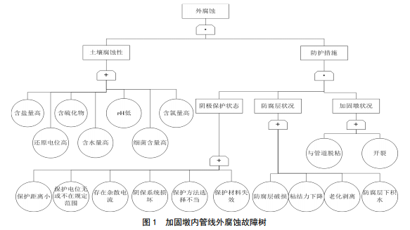 清管三通加固墩內管線(xiàn)外腐蝕故障樹(shù)如圖 1所示。當土壤有腐蝕性且管道防護措施失效才會(huì )發(fā)生外 腐蝕。土壤腐蝕性影響因素包括土壤微生物含量、土壤pH值、土壤含水率等。管道防護措施受加固墩狀況、防腐層狀況和陰極保護狀態(tài)影響,當三者共同失效才會(huì )發(fā)生防護措施失效。要控制加固墩內管線(xiàn)外腐蝕發(fā)生,就要控制可控因素。在土壤腐蝕性、加固墩狀況、防腐層狀況和陰極保護狀態(tài)四個(gè)因素中,土壤腐蝕性無(wú)法改變、加固墩狀況只能通過(guò)開(kāi)挖檢測獲取,防腐層狀況難以檢測,因此只有陰極保護狀態(tài)屬于可控因素。應注意保護電位不足、保護距離小、雜散電流對陰保系統的影響等因素對陰保效果的影響。通過(guò)內檢測對該處管線(xiàn)缺陷情況進(jìn)行監測,以便及時(shí)采取有效措施。