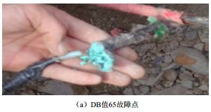 通過(guò)開(kāi)挖陰極保護陽(yáng)極電纜故障點(diǎn),發(fā)現陽(yáng)極電纜出現鼓包,漏出藍色銅銹。分析原因可能是陰保站建站時(shí)期或陽(yáng)極電纜附近存在交叉施工,造成電纜護套破損,電纜銅芯直接和大地接觸,電流從防腐層破損點(diǎn)處流出,加速了故障點(diǎn)的腐蝕,并最終導致電纜完全斷開(kāi),造成陰保系統回路電阻突然變大,設備運行異常。