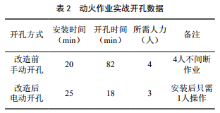 開(kāi)孔機動(dòng)力源改造電機選型配置合理,設計加工附件措施得當。開(kāi)孔機整機外形設計合理、實(shí)現了整機集裝化。通過(guò)不同材質(zhì)、厚度的多次開(kāi)孔試車(chē)以及實(shí)際動(dòng)火作業(yè),證明改造后的開(kāi)孔設備開(kāi)孔質(zhì)量和安全操作得以全面提升,工作穩定、不卡刀,有效縮短了開(kāi)孔時(shí)間,提高改善了開(kāi)孔機的性能和效率,明顯降低了員工勞動(dòng)強度,和采購新設備相比,經(jīng)濟效益可觀(guān)。