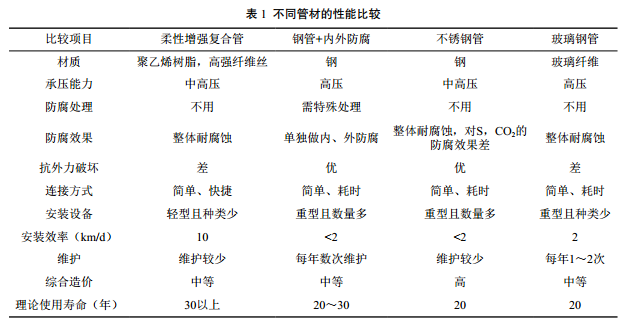 (1)管道材質(zhì)選擇。目前在用的管材類(lèi)型有金屬管+內外防腐、不銹鋼及非金屬管,不同管材的性能比較見(jiàn)表 1。