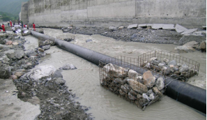河(溝)道水毀的防治措施包括: 對水流沖刷暴露的管道可采用石籠或鋼管樁等臨時(shí)穩管加固;對順河床段和穿越河流段因水流沖刷已經(jīng)暴露的管道應采用漿砌石或混凝土過(guò)水面進(jìn)行管道防護;對水流持續沖刷下切的穿越河段,可在下游修筑谷坊、漿砌石或混凝土地下防沖墻等進(jìn)行防護,同時(shí)應采用擋墻、護岸等措施護岸。如果溝道沖刷物中裹挾有較大的石塊,還應采取一些防撞擊措施,如管道外包砼或漿砌石護底等。
