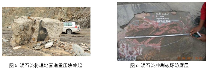 新疆庫米什山谷地區,沿山谷敷設的管道和壓重塊都被泥石流巨大的推浮力推浮到地表,造成防腐層破壞及形成管道表面缺陷(圖 5、圖 6)。